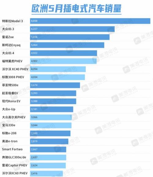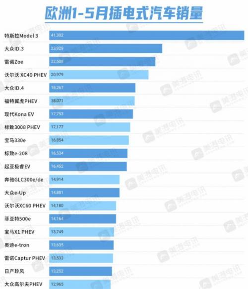 值得注意的是,这是今年首次纯电动汽车霸占了排行榜的前五名。下图为欧洲5月份插电式电动汽车市场销量排名前20的车型: