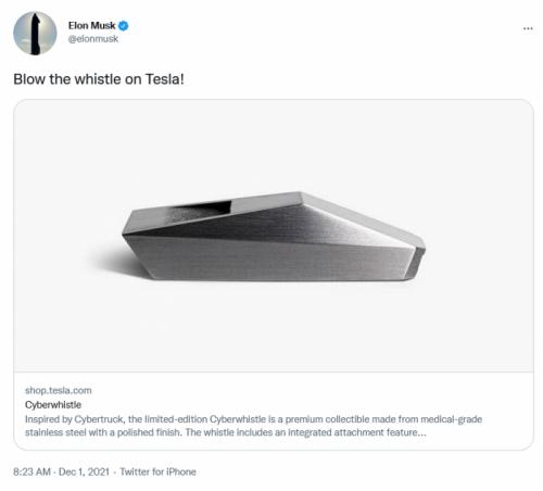 而特斯拉推出的口哨可就没这么多作用了,该口哨主要源于即将新推出的电动卡车Cybertruck灵感,在外形上也形似于Cybertruck。材质主要由医用级不锈钢制造而成,表面进行了抛光。