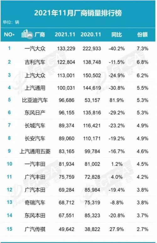 从具体数据来看,2021年11月乘用车市场零售达到181.6万辆,同比下降12.7%,相较2019年11月下降6%,11月零售总体表现差强人意。排名前十的厂商中,一汽大众、上汽大众大众、上汽通用、东风日产、长安汽车、上汽通用五菱均跑输大盘,车市之冷可见一斑。
