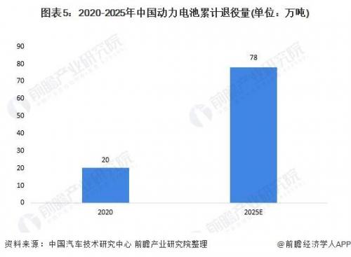 各企业布局动力电池回收的另一原因是动力电池回收市场规模庞大。作为全球新能源汽车、动力电池第一大国,我国退役电池量是十分庞大的。据中国汽车技术研究中心公布数据,2020年我国动力电池累计退役量约20万吨,2025年累计退役量约为78万吨。