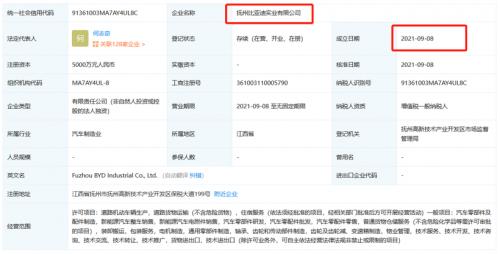 盖世汽车从企查查获悉,抚州比亚迪实业有限公司于2021年09月08日成立,该司注册地位于江西省抚州市抚州高新技术产业开发区保税大道199号,法定代表人为何志奇,注册资本5000万人民币。股权穿透图显示,该公司由比亚迪汽车工业有限公司全资控股。