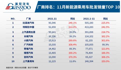 自主品牌新能源车渗透率大幅提升的同时,内部也呈现出不均衡的发展状态。一部分头部车企在新能源领域迎来了历史上的高光时刻,从11月新能源乘用车批发销量排名前十的厂商来看,进入这一榜单的外资品牌车企仅特斯拉一家,其它均为中国本土车企。其中,比亚迪以超过9万辆的单月销量一骑绝尘,登顶11月新能源乘用车批发销量厂商排名之首。今年1-11月,比亚迪旗下新能源乘用车累计销量已达50.5万辆,同比增幅高达225.6%。这一较为突出的市场表现,也对比亚迪近期市值的攀升起到了直接推动作用。