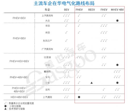 主流车企在华电气化路线布局,信息来源:盖世汽车研究院《混合动力产业报告》
