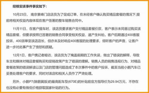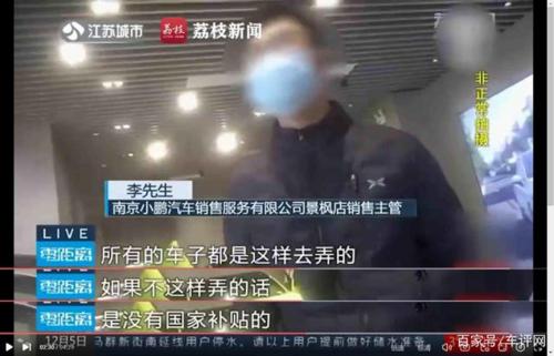 12月初,小鹏汽车遭遇“骗补”事件。一位准车主挑选了一辆小鹏P7,并交定金签了合同。但在提车时却被告知仍需加价7000元提车。对此销售主管表示,加钱提车涉及到国家补贴问题,若整车价格超过30万的话便拿不到国家补贴,因此卖车均是先做低合同价格,将价格控制在30万以下,之后再把价格补齐,实际上车主所付的钱就是原车款,并未多收钱。并强调,“我们都是这样操作的”。