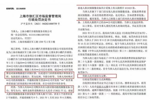 令人大跌眼镜的是,“骗补”事件的热度还未消退,上海市徐汇区市场监督管理局在12月14日发布的处罚决定书显示,小鹏汽车因为线下4S门店擅自采集43万张消费者的人脸照片被罚款10万元。
