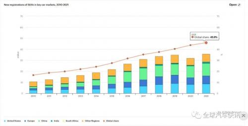 纵观整个新冠疫情期间,全球SUV的销量依然很强。2020-2021年间,全球SUV的销量增幅逾10%。而在2021年,SUV在全球汽车销量中的占比在45%以上――不论是销量还是市场份额,均再创新高。