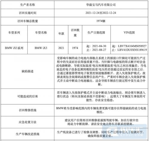 电车汇消息:近日,华晨宝马汽车有限公司根据《缺陷汽车产品召回管理条例》和《缺陷汽车产品召回管理条例实施办法》的要求,向国家市场监督管理总局备案了召回计划。自2021年12月24日起,召回生产日期从2021年4月30日到2021年8月27日的国产iX3,共计1974台。