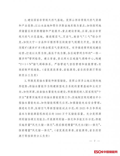 积极发展抽水蓄能和新型储能。发挥山西多山地丘陵的地形优势,将抽水蓄能作为构建新型电力系统的重要基础和主攻方向,加快浑源、垣曲抽水蓄能电站建设,积极推进纳入国家规划“十四五”重要实施项目的抽水蓄能前期工作,因地制宜规划建设中小型抽水蓄能电站,加快储能规模化应用,加强储能电站安全管理,推进电化学、压缩空气等新型储能试点示范,到2025年力争形成基本与新能源装机相适应的1000万千瓦储能容量。充分发挥源网荷储协调互剂能力,开展源网荷储一体化和多能互补示范,积极实施存量“风光火储一体化”,稳妥推进增量“风光水(储)一体化”,探索增量“风光储一体化”。