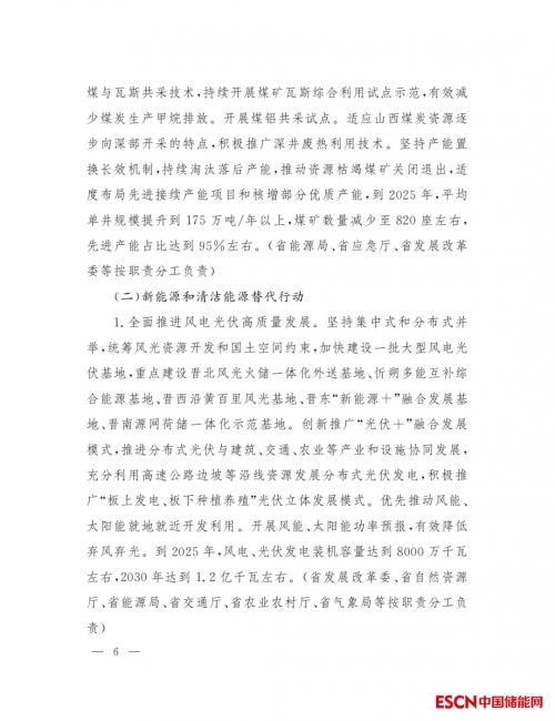 全面推进风电光伏高质量发展。坚持集中式和分布式并举,统筹风光资源开发和国土空间约束,加快建设一批大型风电光伏基地,重点建设晋北风光火储一体化外送基地、忻朔多能互补综合能源基地、晋西沿黄百里风光基地、晋东“新能源+”融合发展基地、晋南源网荷储一体化示范基地。创新推广“光伏+”融合发展模式,推进分布式光伏与建筑、交通、农业等产业和设施协同发展,充分利用高速公路边坡等沿线资源发展分布式光伏发电,积极推广“板上发电、板下种植养殖”光伏立体发展模式。优先推动风能、太阳能就地就近开发利用。开展风能、太阳能功率预报,有效降低弃风弃光。到2025年,风电、光伏发电装机容量达到8000万千瓦左右,2030年达到1.2亿千瓦左右。
