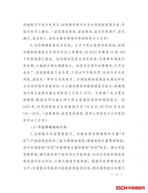 加快构建新型电力系统。立足可再生能源有效消纳,持续加强新能源发电并网和送出工程建设,到2025年建成10座500千伏新能源汇集站。加快煤电机组灵活性改造,完善煤电调峰补偿政策,大幅提升煤电调峰能力。加快灵活调节电源建设,引导自备电厂、传统高载能工业负荷、工商业可中断负荷、电动汽车充电网络、虚拟电厂等参与系统调节。合理统筹新能源发电建设和电力灵活性调节资源供给,大力推动煤炭和新能源优化组合,新建通道可再生能源电量比例原则上不低于50%。完善推广电力需求侧管理,提高电网对高比例可再生能源的消纳和调控能力。到2025年,电网削峰能力达到最高负荷5%左右,到2030年达到5%-10%。
