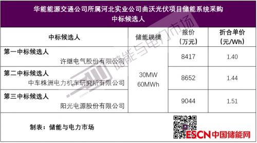 许继电气股份有限公司总报价8417万元,折合单价1.4元/Wh,成为第一中标候选人。