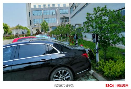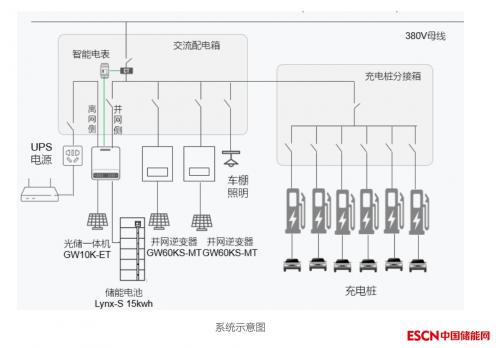整个车棚包括120kW的光伏、10kW/15kWh的储能示范及1个60kW直流充电桩、5个7kW交流充电桩,如下图所示。