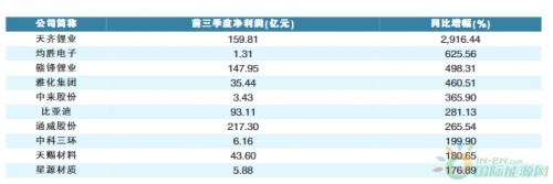 部分新能源产业链公司前三季度业绩情况