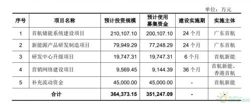 此次IPO,首航新能拟发行不超过9,300万股普通股,占公司股份总数的比例不低于10%。相关项目预计公司使用募集资金35.1247亿元,预计投资规模为36.4373亿元。