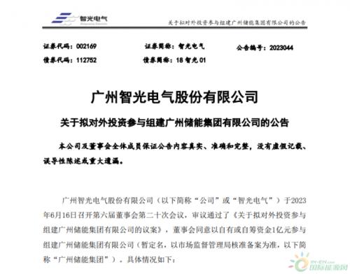 6月16日晚间,A股公司智光电气、广州发展相继公告,参与出资组建广州储能集团有限公司(暂定名,以工商登记为准,下称“广州储能集团”)。此外,另一家广州上市公司鹏辉能源也现身股东名单。