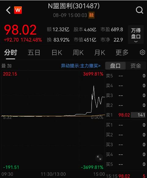 8月份,锂电池正极材料企业天津国安盟固利登陆创业板首日,盘中涨幅便一度飙升达3699%,从5.32元发行价冲到最高202.15元/股,以暴涨37倍的惊人成绩创下今年新股首个交易日盘中最大涨幅纪录,被奉为“新股神话”。截至收盘,公司股价涨幅仍达1742%。