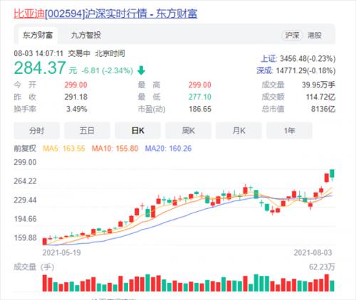 而今比亚迪又开始了新一波的股价上扬,从5月中旬以来,其股价就开始稳步上涨,截止今日发稿,比亚迪A股盘中价格为284元。与其141元的谷底相比,两个多月以来,比亚迪股价狂涨超过1倍,投资者也是赚的盆满钵满。
