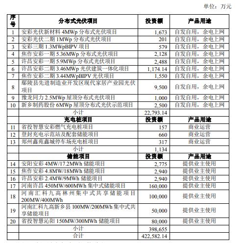 该投资计划包括,安彩光伏新材料4MWp分布式光伏项目、安彩光伏二期1MWp分布式光伏项目等10个分布式光伏项目,3个充电桩项目以及7个储能项目。光伏项目拟投资2.28亿元,储能项目总计投资10亿元