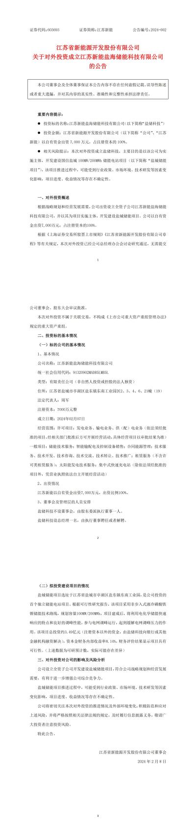 近日,江苏新能发布公告称,根据战略规划和经营发展需要,公司出资设立全资子公司江苏新能盐海储能科技有限公司,并以其为项目实施主体,开发建设盐城储能项目。公司以自有资金出资7000万元,占注册资本的100%。