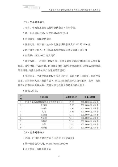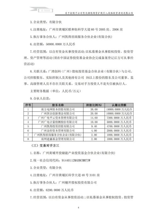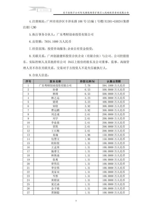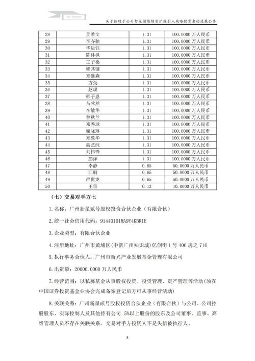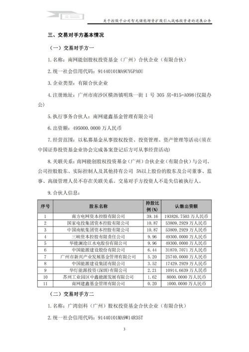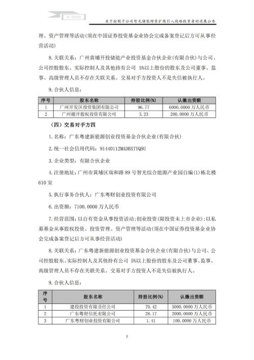 智光电气公告中披露了7家投资人的出资情况,合计投资约3.3亿元,国有资本成为主角。其中南网资本控股公司领衔的南网能创股权投资基金和广湾创科(广州)股权投资基金出资1.5亿元,广州开发区投资集团有限公司控股的广州黄埔开投储能产业投资基金出资6000万元,建投投资有限责任公司控股的广东粤建新能源创业投资基金出资7000万元。