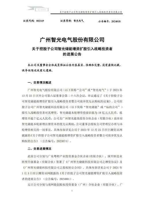 3月15日,智光电气对外公告了控股子公司智光储能的增资扩股进展,本轮增资投资人已累计实缴出资6.18亿元。