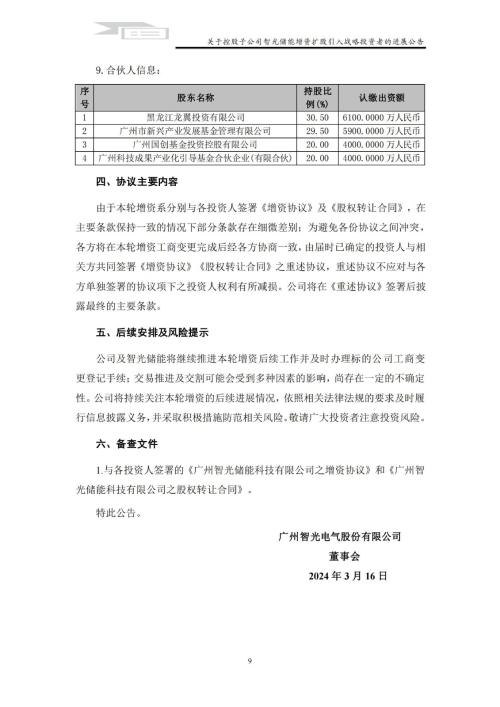 智光电气表示,公司及智光储能将继续推进本轮增资后续工作并及时办理标的公司工商变更登记手续;交易推进及交割可能会受到多种因素的影响,尚存在一定的不确定性。公司将持续关注本轮增资的后续进展情况,依照相关法律法规的要求及时履行信息披露义务,并采取积极措施防范相关风险。敬请广大投资者注意投资风险。