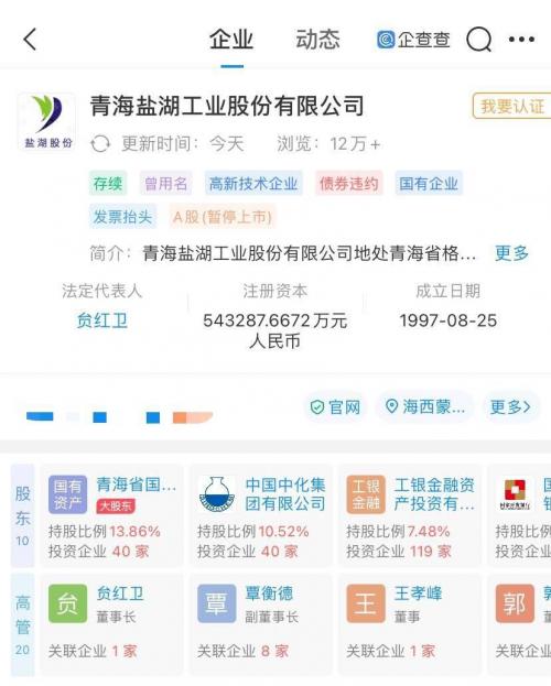 企查查APP显示,盐湖股份成立于1997年,是国内最大的钾肥企业,同时拥有碳酸锂产能布局,其大股东为青海省国有资产投资管理有限公司。