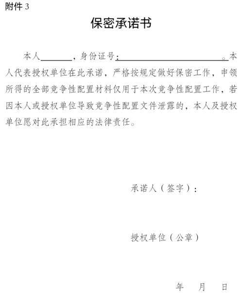 1.申请报名。凡愿意参加项目竞争性配置的企业,应于2024年12月19日至2024年12月26日17:00前将申请材料发送至工作邮箱jshfjp@163.com。包括:(1)报名企业营业执照扫描件;(2)集团唯一授权证明(见附件1,需加盖公章);(3)法定代表人授权书扫描件(见附件2,需加盖公章);(4)申领人员本人身份证扫描件;(5)保密承诺书扫描件(见附件3,需加盖公章);。