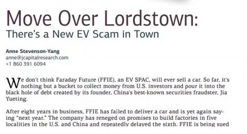 据国内媒体报道,美国本土做空机构J Capital Research昨日发布了一份关于FF公司的沽空报告,直言“不认为FF公司能卖出哪怕一辆汽车”。据愁,J Capital Research这份28页的沽空报告从FF公司投产能力、资本运作表现、研发投入状况以及贾跃亭自身在国内受到的处罚等多个角度表达了其对FF公司的质疑。